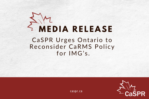 FOR IMMEDIATE RELEASE Oct 20, 2025 CaSPR Urges Ontario to Reconsider CaRMS Policy for IMG’s The Canadian Society of Physician Recruitment (CaSPR) joins the Canadian Medical Association (CMA) and the